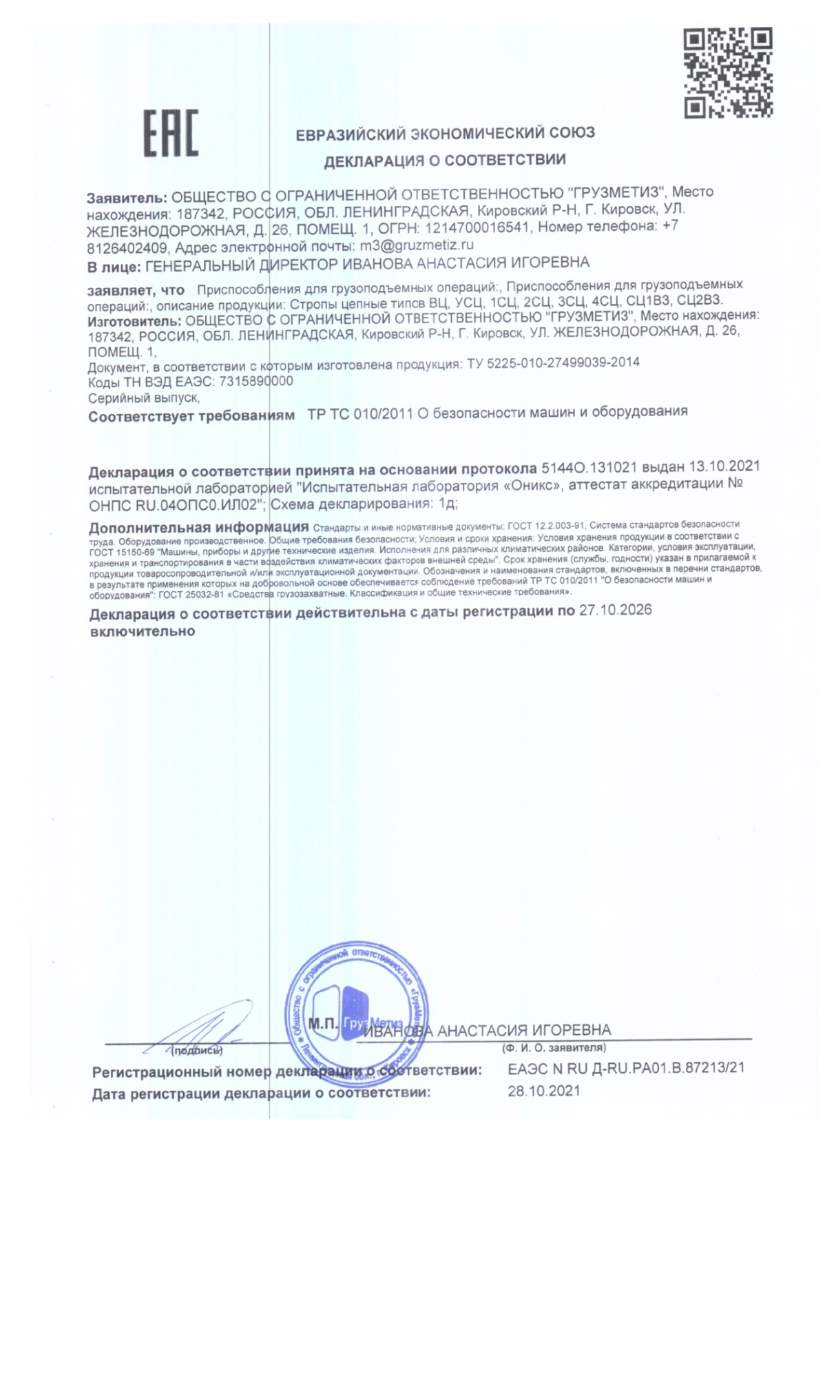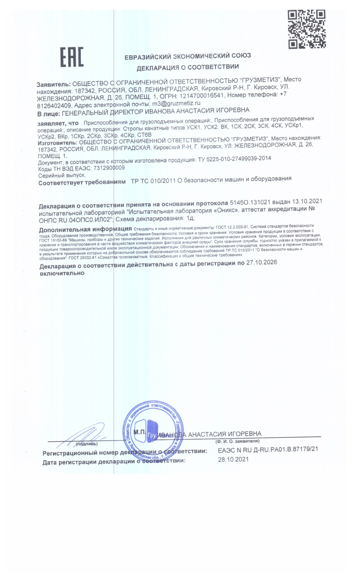 Декларация соответствия ООО "ГрузМетиз" на канатные стропы