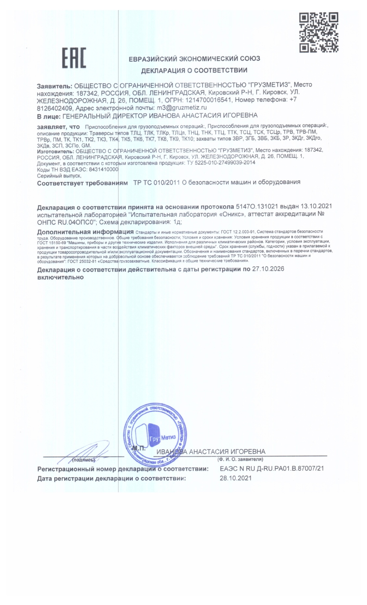 Декларация соответствия ООО "ГрузМетиз" на цепные траверсы