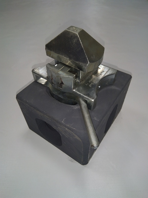 - Ручной твистлок. Конструктивные особенности: литой корпус, запорная рукоятка и штырь. Штырь закладывается в гнездо углового контейнерного фитинга и поворотом ручки надёжно фиксирует тару.