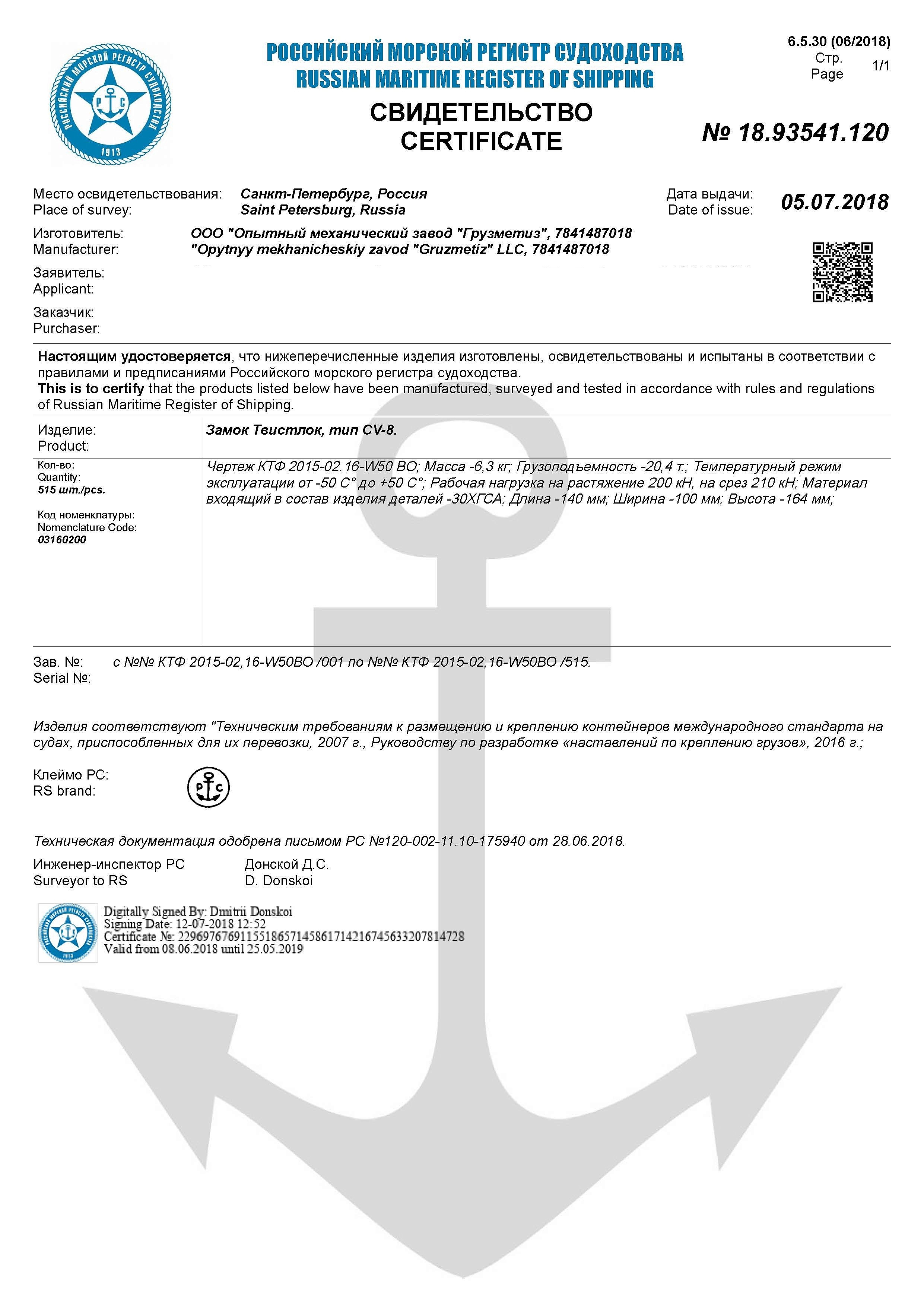 ООО«Грузметиз» производит и поставляет сертифицированные ручные твистлоки и полуавтомат любой конфигурации. Устройства фиксируют контейнеры друг с другом в штабеле, к палубным гнёздам, люковым крышкам трюмов, соединяют контейнеры в контейнерных терминалах.