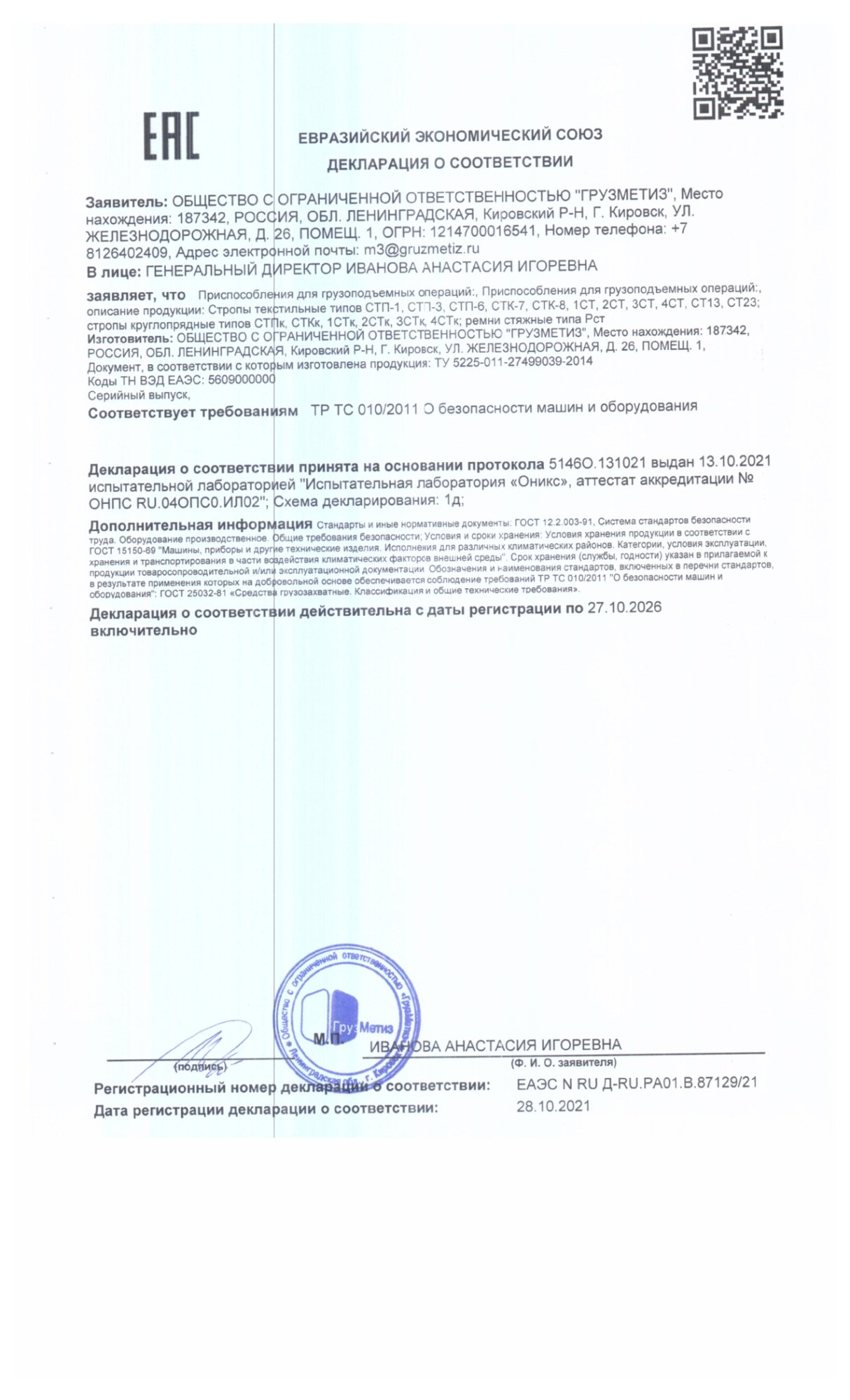 Декларация соответствия ООО "ГрузМетиз" на канатные стропы